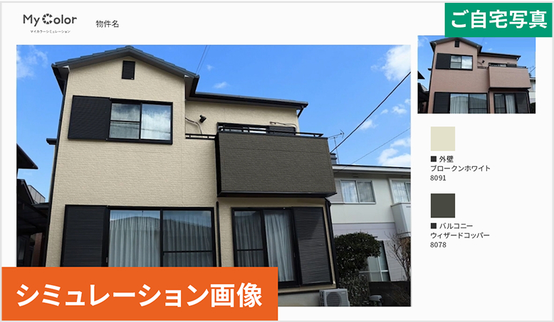当サイト経由でお申し込みいただいたお客様は、ご自宅の写真を使用して納得いただくまで色のシミュレーションを行っていただけるツール(マイカラーシミュレーション)最大18,000円相当を無料でご利用いただけます!