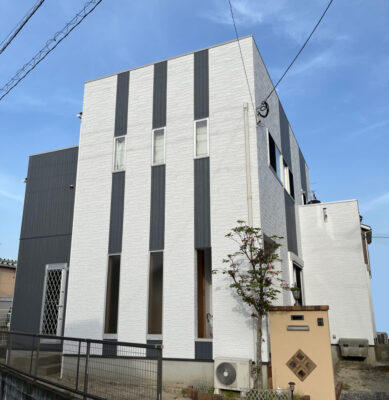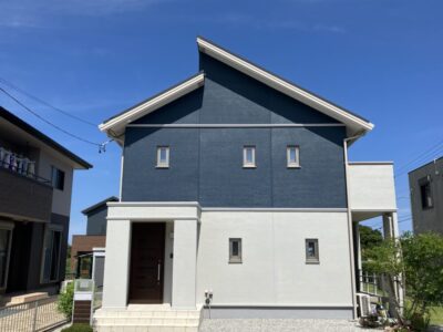縦のラインや白い部分が効いているため、濃色主体でも重たくなりすぎず、シャープで洗練された印象にまとまっています。ブルー系でしっかり個性を出したい施主様に向いた外観です。