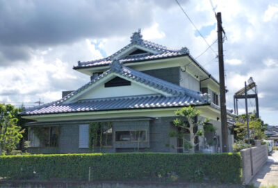 和風の建物らしいどっしりした形に、グレーの安定感と青みの上品さが合わさることで、落ち着いて見えるのに古く見えない、品のある仕上がりになっています。